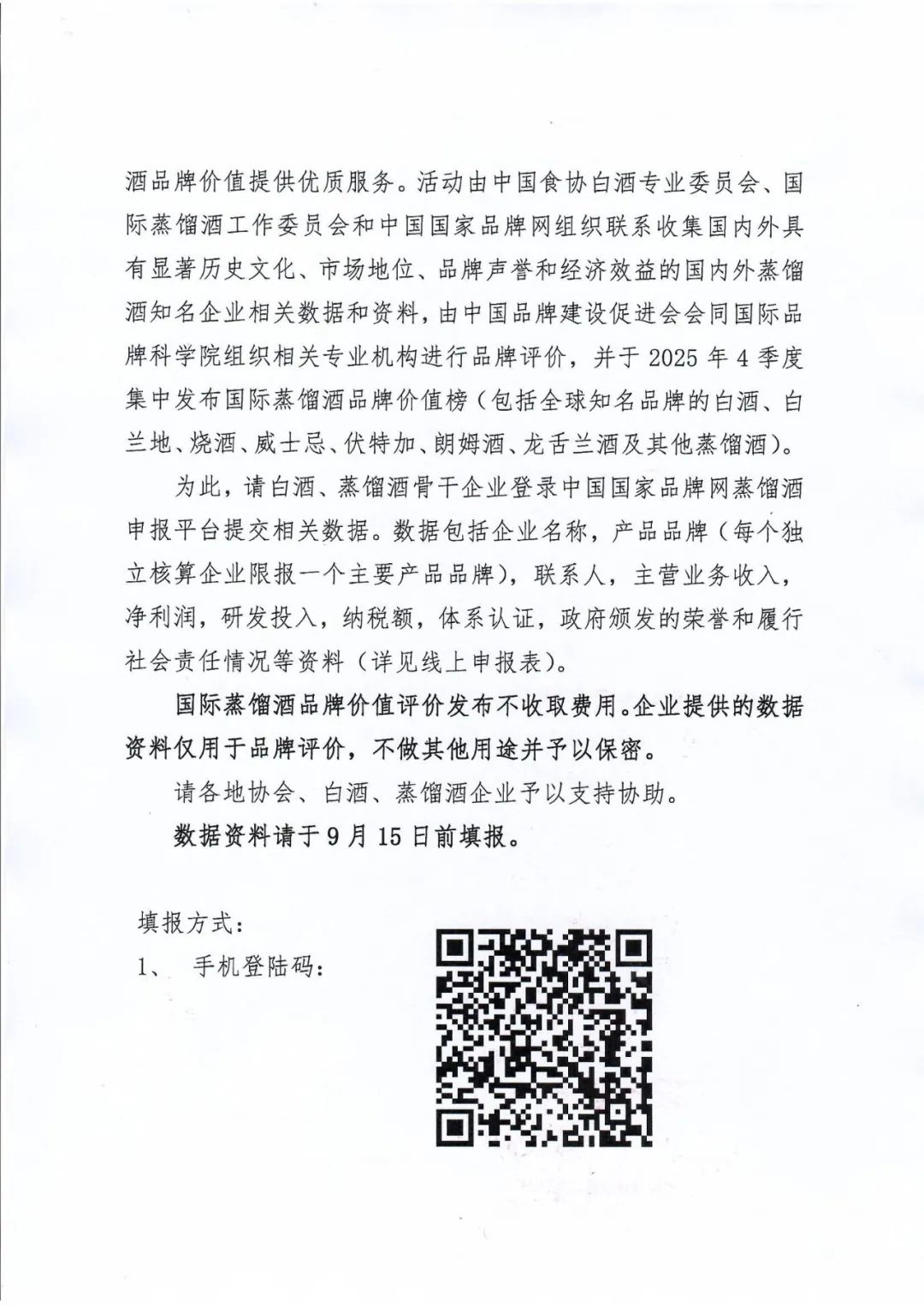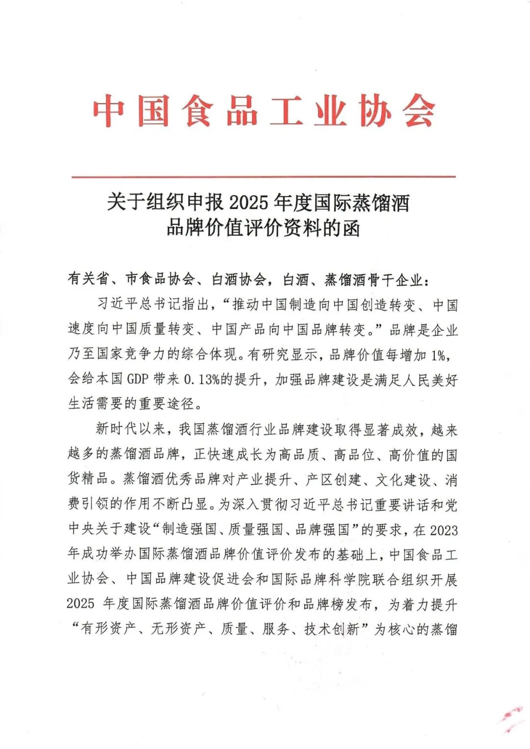 关于组织申报2025年度国际蒸馏酒品牌价值评价资料的函